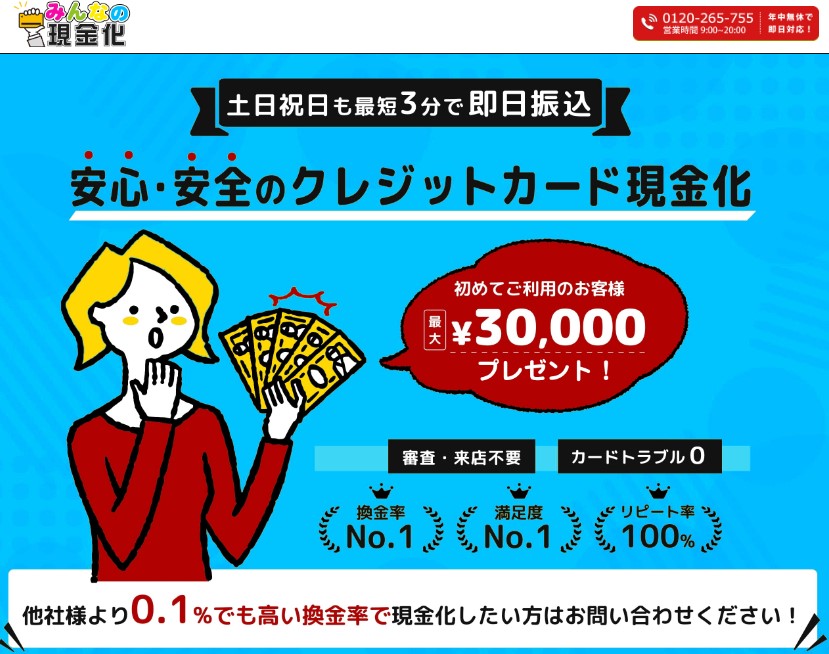 手続きのすべてがオリジナルツールを利用するので、創業以来カードトラブルを一度も起こしていない実績あり、さらに換金率にこだわってるためにリピート率が高く、土日祝日も対応、余分な手数料はかからず入金時間はリアルタイムでチェックが可能!