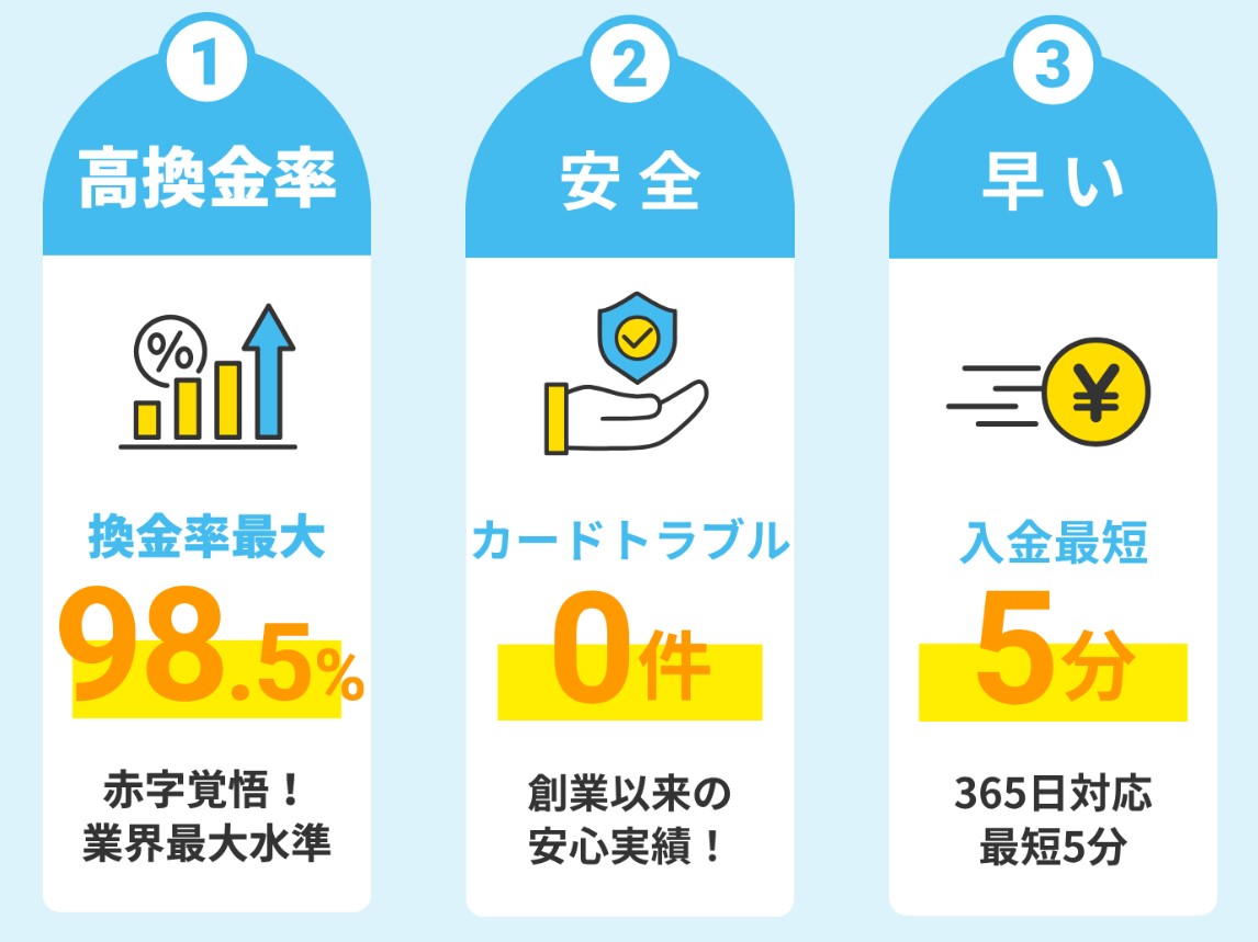 ミドル金額の換金率が異常に高い特徴を持ち、カード事故0件という大きな安心感から口コミ人気を集め、安全でスピーディーな現金化を好条件で提供する総合力の高さが評判となっています。他社より1%でも低いようであれば電話で説明すれば、他社よりも高い換金率の提示が可能です。