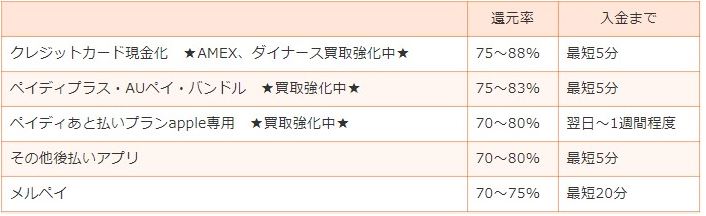 業界では珍しく【AUペイ・バンドル・メルペイ・ペイディ】といった後払いアプリも現金化をしてくれます。