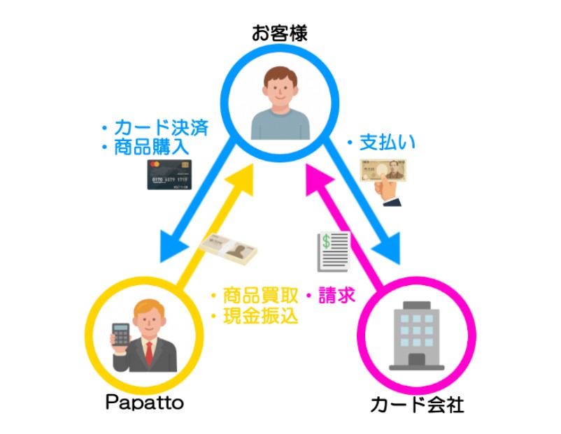 承知いたしました。簡単に流れをご説明しますね。お客様のクレジットカードで当店が指定する商品をご購入いただき、その商品を私どもが買取り、買取代金をすぐにお客様の口座へお振り込みする流れです。