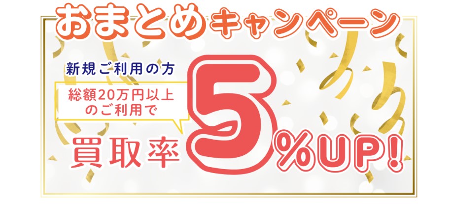 ネットで色々調べましたが5%アップはあまり見かけません。オンラインでの取引なので利便性や換金率の高さは注目できます。スタッフの顔が見えないのが少し残念です。